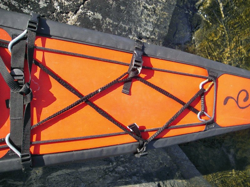 Auf den Bildern sieht man die Lösung. Es handelt sich um das Original-Skeg, welches mittels eines Zurrmechanismus verstellbar gemacht wurde. Benötigt werden außer dem Skeg nur etwa 3 m Lochseil, 2 kleine und 2 große Edelstahlkarabiner, sowie ein kurzes Stück starkes Gummiseil. Der Kostenaufwand (ohne das Skeg) beträgt gerade einmal 11 €.