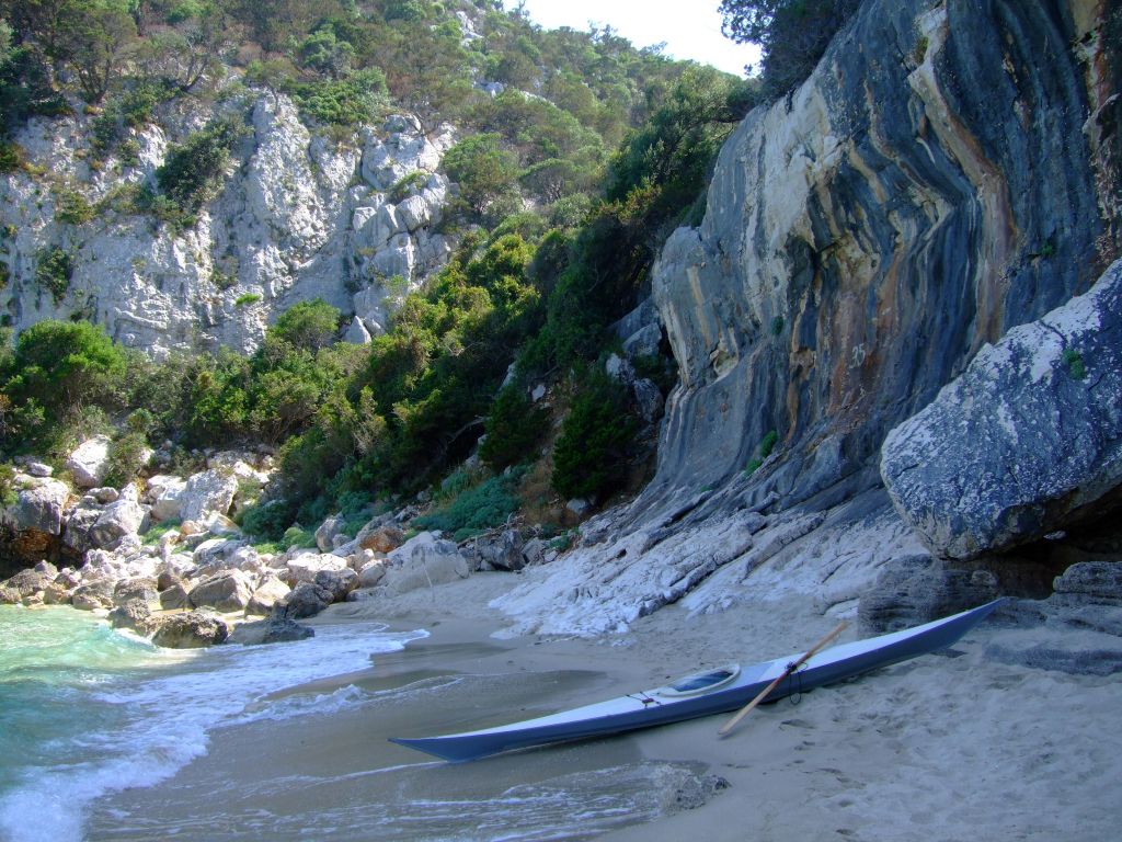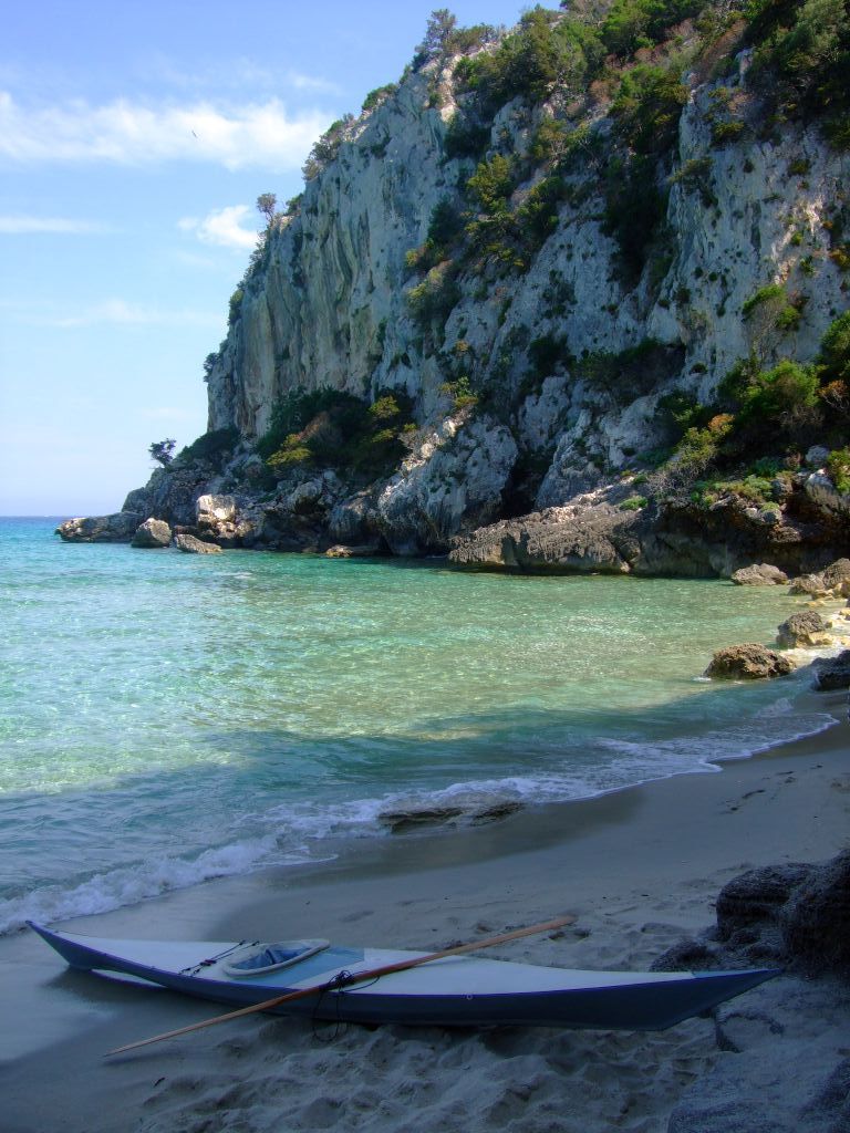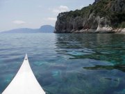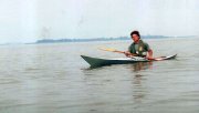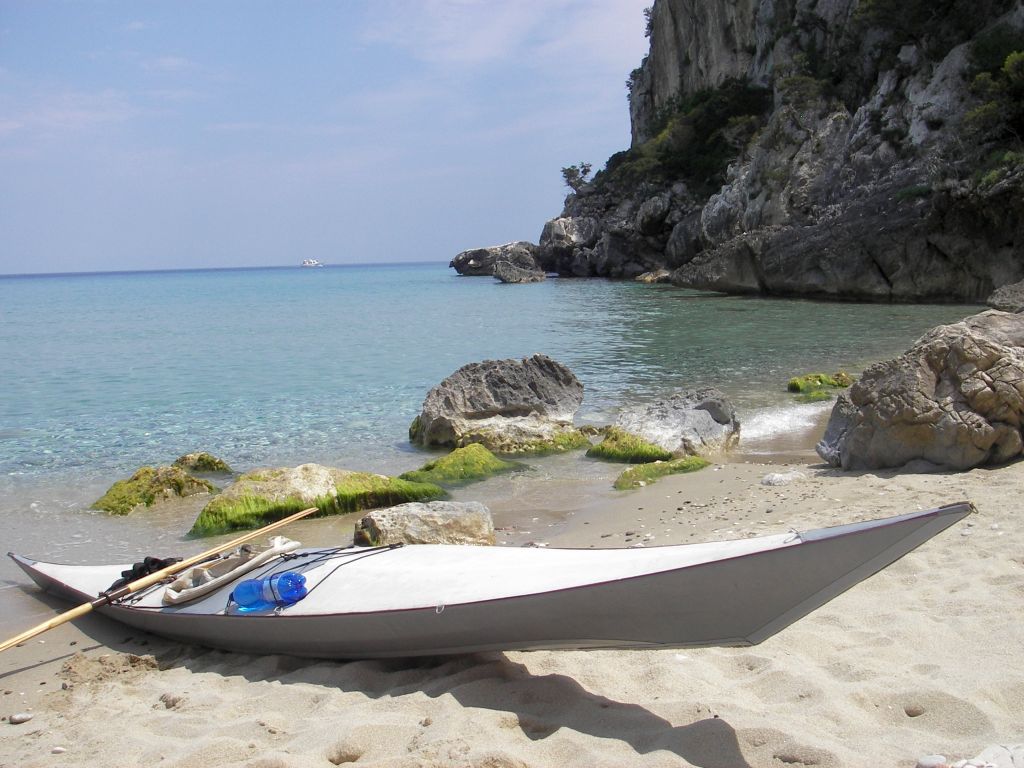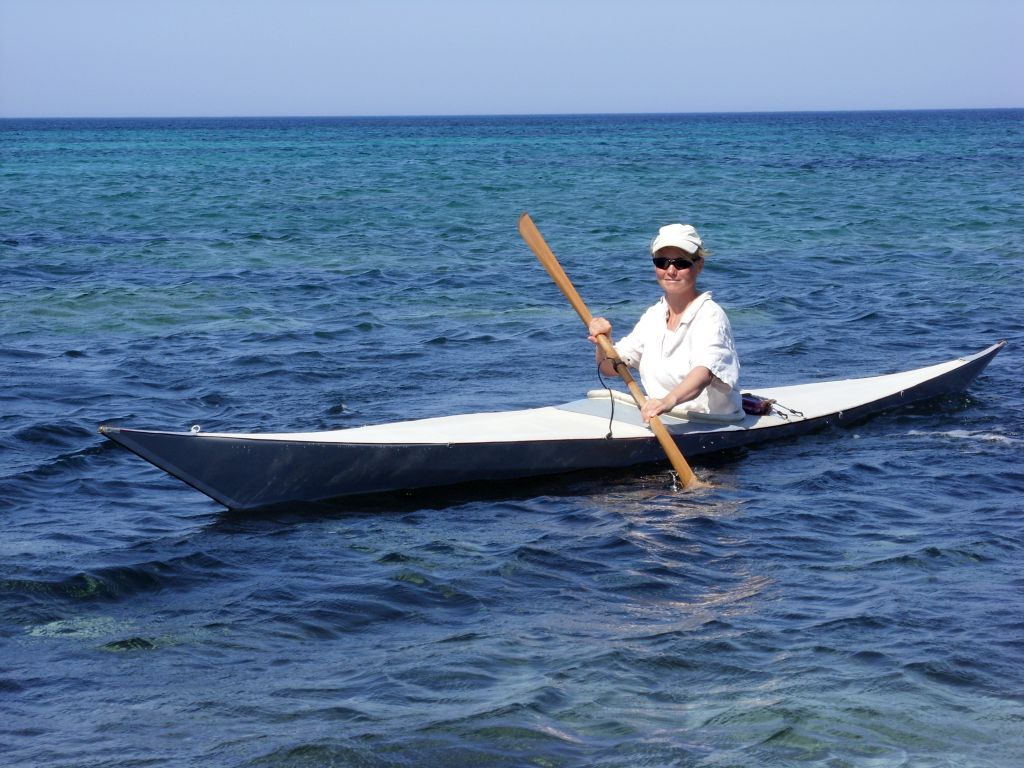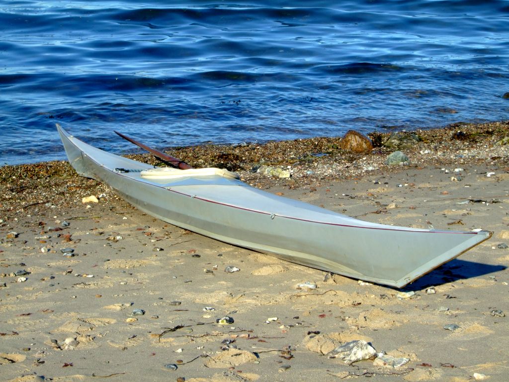Das Boot läuft leicht und ohne großen Kraftaufwand sehr zügig. Die Spantform sorgt dafür, dass das Boot kaum Neigung zum Surfen zeigt (kann ich absolut nicht leiden. Zum Surfen habe ich ein altes Slalompolyesterboot). Die Anfangsstabilität ist mäßig, die Endstabilität sehr viel besser. Kanten läßt es sich, bis Wasser in die Luke läuft (ohne zu stützen). Rollen ist sehr einfach, dank der engen Luke und der Einbauten sitze ich stets fest im Boot und brauche kein Herausfallen zu fürchten. Die Windanfälligkeit ist gering, durch die Flosse läuft das Boot bei leichten und mittleren Windstärken neutral (worüber ich ausgesprochen glücklich bin. Da hat sich der erste Eski als Testboot bewährt). Ohne Steuer wäre es sonst auch kein Vergnügen. Kein Platschen, sieht man einmal von dem Klatschen der über dem abtauchenden Heck oder Bug zusammenschlagenden Wellen ab. Hier zeigen sich dann auch die Nachteile der Konstruktion: durch die vor allem beladen recht geringe Freibordhöhe (1 – 4 cm) fährt das Boot extrem nass. Ohne Spritzdecke geht schon auf kleinen Seen nichts. Auch Starts und Landungen in nur leichter Brandung sind eine recht nasse Sache. Hier hilft der ebenfalls selbst gefertigte Kentersocken. Und Gepäck geht auch nicht viel rein, für eine Wochenendtour langt es aber. Vor allem die geringe Staukapazität hat mich aber doch dazu gebracht, mit dem Planen eines Nachfolgemodells zu beginnen.