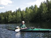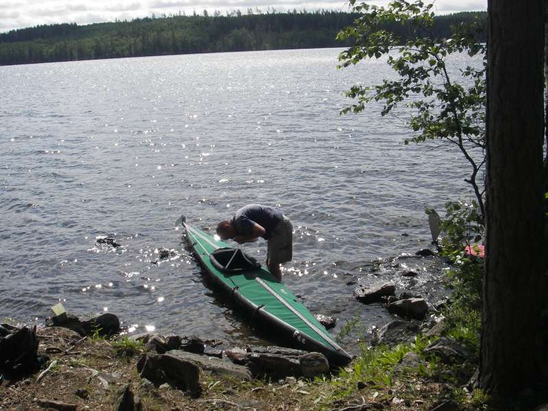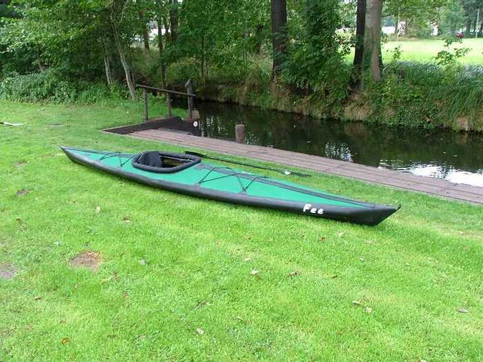 Mit etwas Gezerre passt eine Seesocke vom Feathercraft K1 auf den Süllrand. Auch der Komfortsitz von FC ist benutzbar, wenn der auf dem Kielrohr vorhandene Klettflausch gegen ein Kletthakenfliess ausgetauscht wird und beiderseits des Kielrohres 10mm dicke Evazoteplatten gelegt werden. Egal welcher Sitz - die Lehne sollte gegen Vorklappen gesichert werden. Dazu zwei Zelthaken mit Gummiband befestigen und die Haken am Spant 4 einklinken. Die oben beschriebenen Probleme mit der TPU-Haut haben im Herbst 2008 dazu geführt, daß sich Fee seitdem nicht mehr in TPU-"Green", sondern ganz schick und neu in ein Hypalon-"Teal"-Ausgehkleid hüllt. Mädchen haben eben gerne Wechselgarderobe...